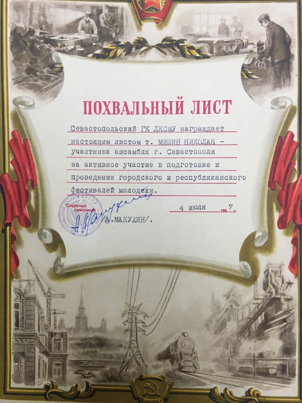 Николай Сергеевич 60 лет назад выступал с ансамблем «Песни и пляски» на Всемирном фестивале в городе Севастополь и был награжден дипломом и похвальным листом.