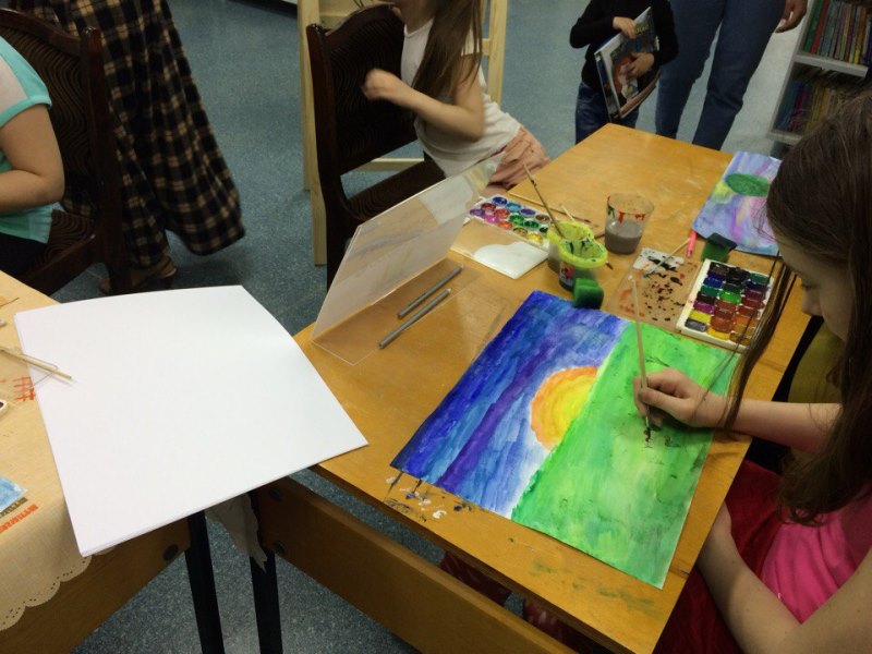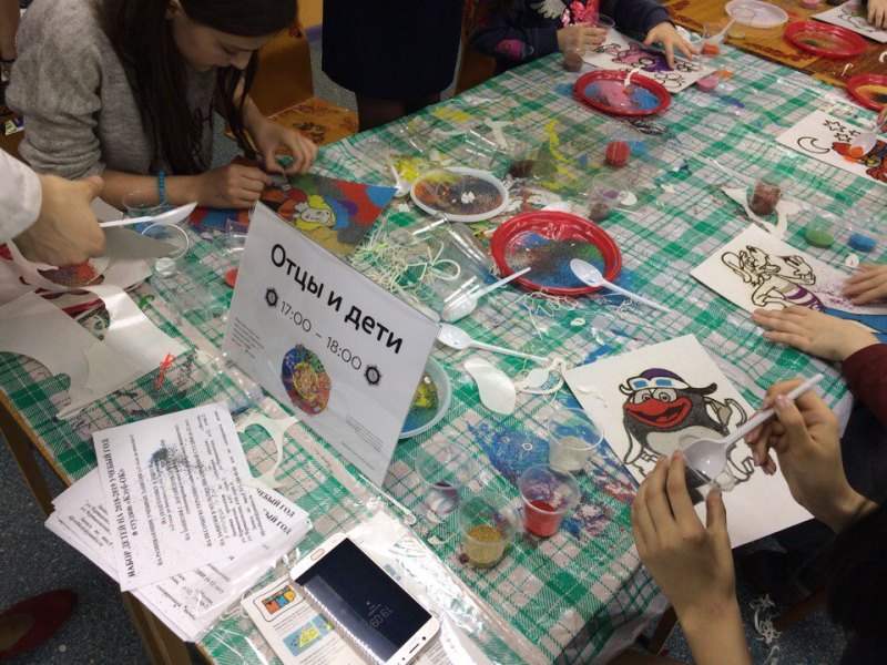 Внутри здания районной читальни было тепло, уютно, светло и весело. В абонементском зале, который на время «Библионочи» стал «Мастерской радости», собрались дети: в одном углу своим интеллектом мерились юные шахматисты, в другом гости создавали картины с помощью цветного песка.