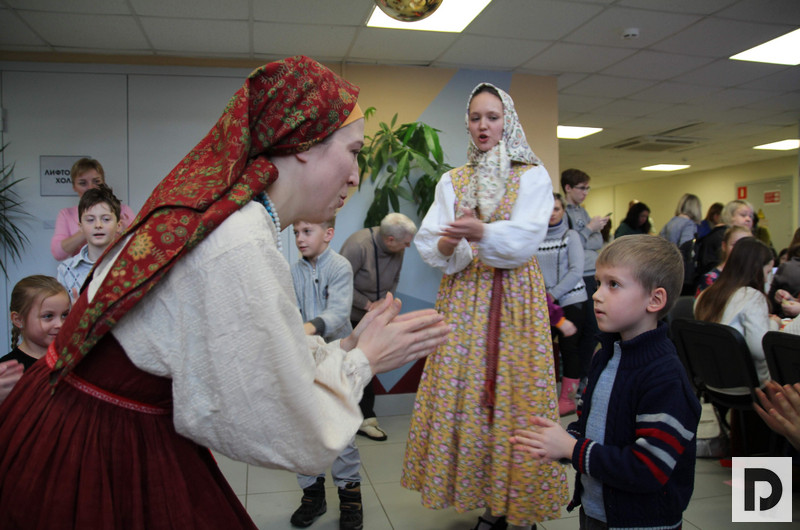 Перед началом театрализованного представления в фойе центра развернулись конкурсы, игры и хоровод со сказочными героями, которыми стали волонтеры чертановской церкви.