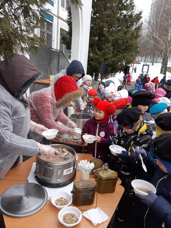 Порцию свежеприготовленной каши с мясом получил каждый боец «Зарницы» в школе № 556. Игру провели в честь Дня защитника Отечества.