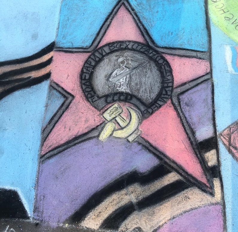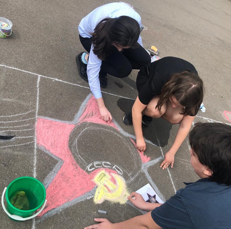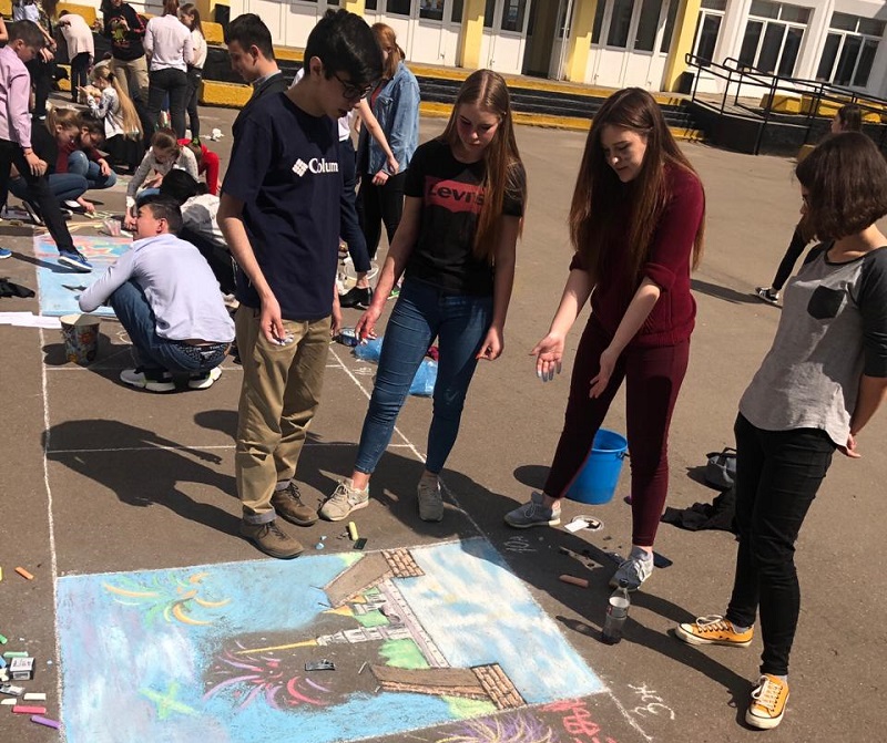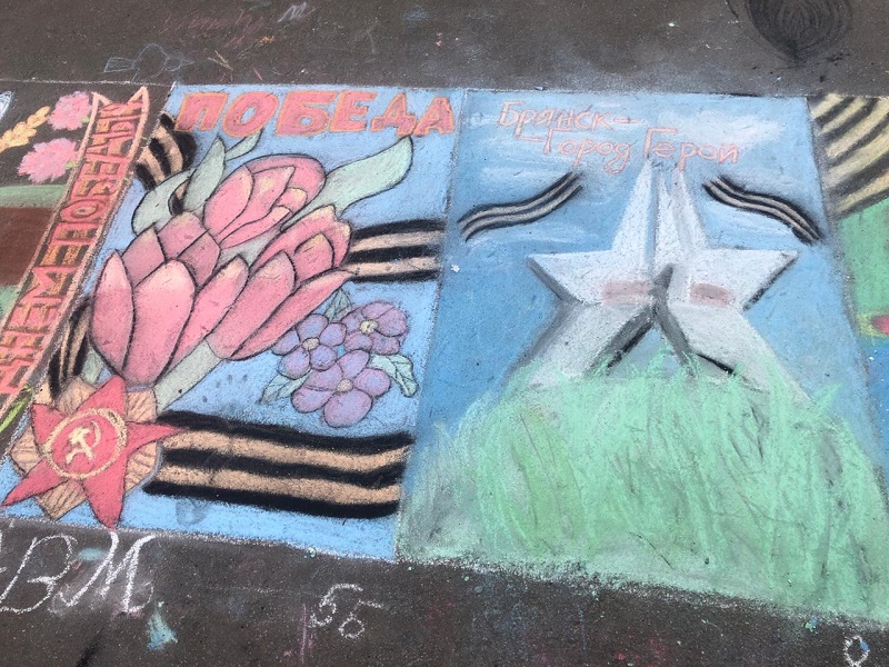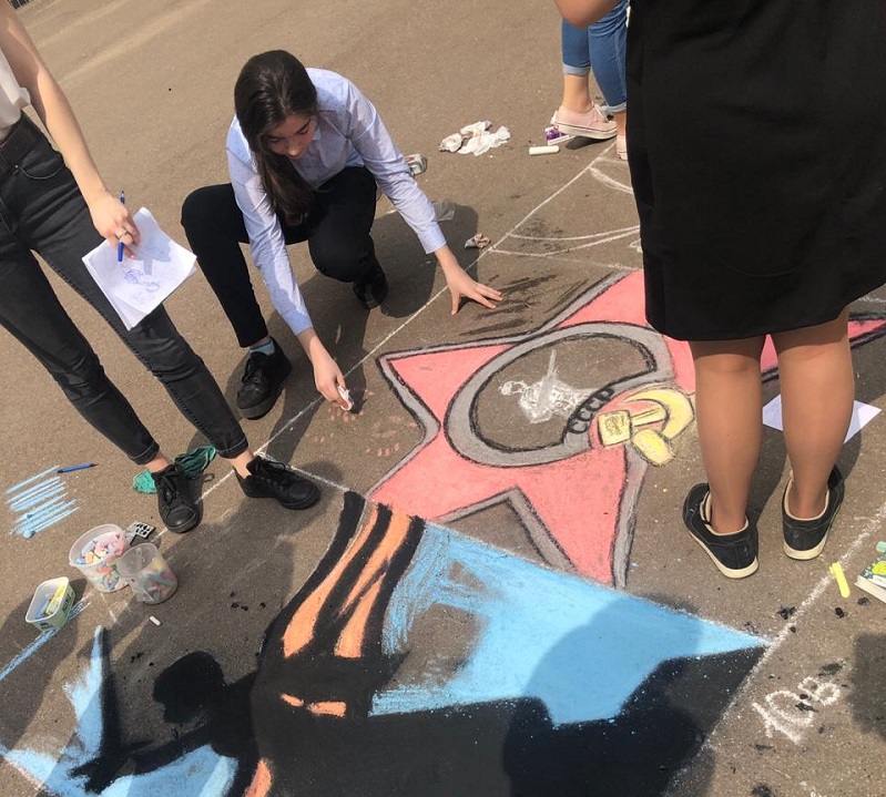 Возле корпусов дети рисуют мелом открытки ко Дню Победы. Творческое задание школьники выполняют всем классом. На асфальте уже появились изображения городов-героев, фрагменты знаковых битв Красной армии и салют Победы. Старшеклассники смогли изобразить самое масштабное танковое сражение – битву на Курской дуге.