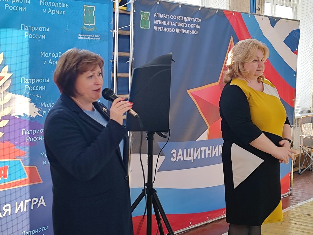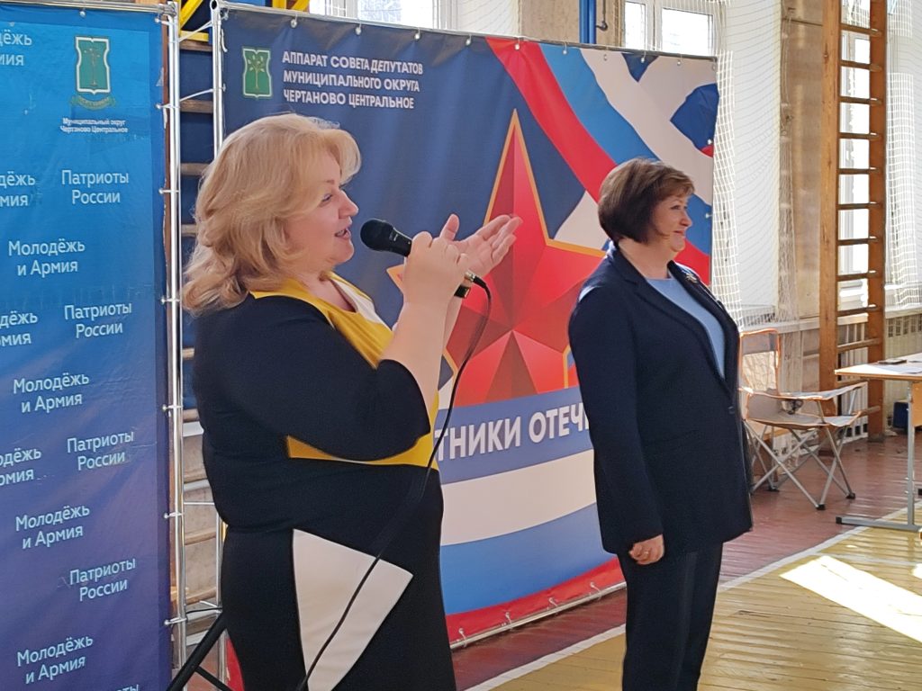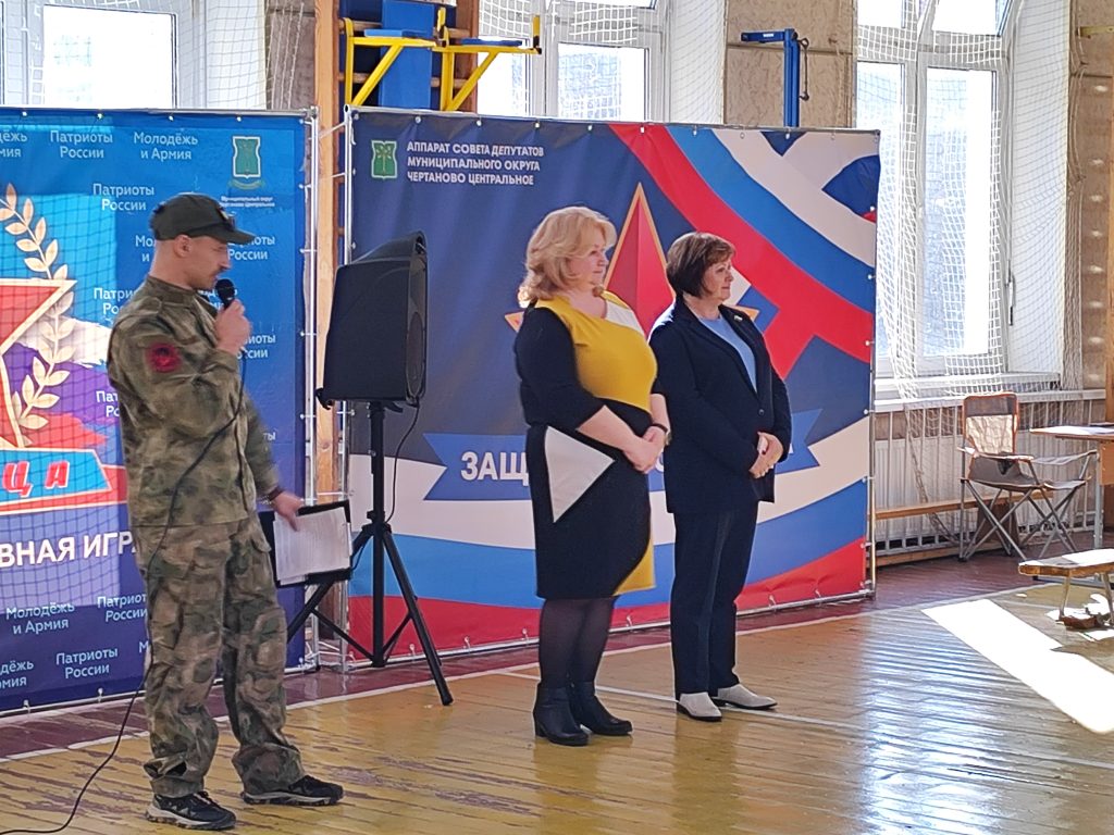 Военно-патриотическое мероприятие «Защитники Отечества» прошло 2 апреля в муниципальном округе Чертаново Центральное. Участников приветствовали руководитель аппарата Совета депутатов Анна Гурова и депутат, директор школы №556 Евгения Ларионова.