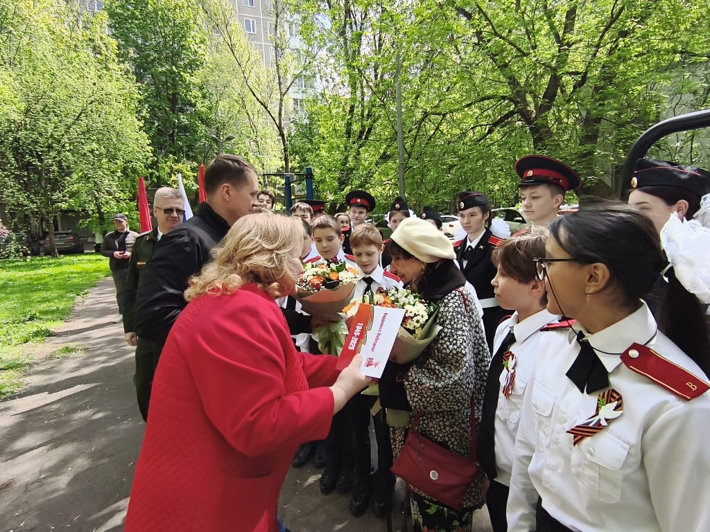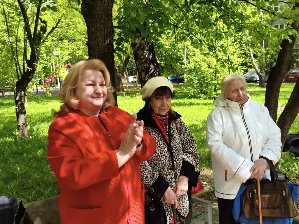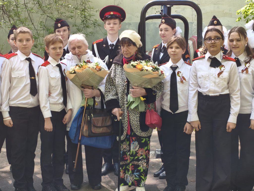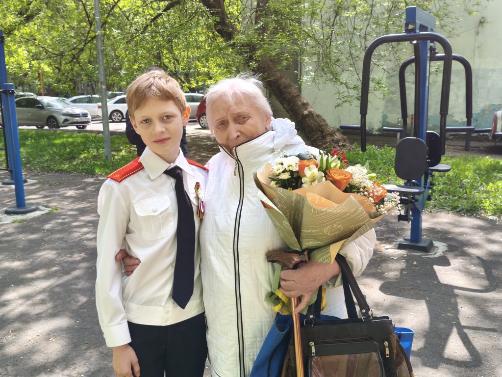 В этот день в гости к ветеранам, живущим на улице Красного Маяка, пришли артисты и учащиеся кадетского класса школы №1582. Поздравление провели на улице во дворе рядом с домом, где живут женщины. Вместе со школьниками перед главными героинями мероприятия выступили старшие воспитатели Игорь Щеголев и Руслан Лящук. Они — профессиональные музыканты, их выступление просто покорило женщин.