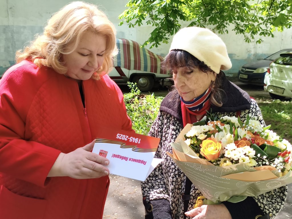 Ветераны Великой Отечественной войны Наталья Борисовна Обухова и Лариса Алексеевна Капранова получили 7 мая поздравления с наступающим 80-летием Победы в Великой Отечественной войне. Заместитель главы управы района Андрей Быстров и руководитель аппарата Совета депутатов муниципального округа Чертаново Центральное Анна Гурова вручили им красивые букеты и подарки.