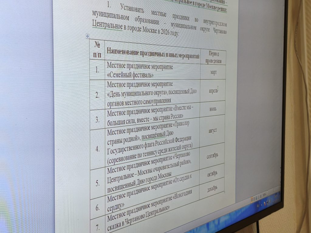 Депутаты рассмотрели на прошедшем 21 октября заседании Совета вопрос об установлении местных праздников и проведении военно-патриотических мероприятий во внутригородском муниципальном образовании — муниципальном округе Чертаново Центральное в 2026 году.