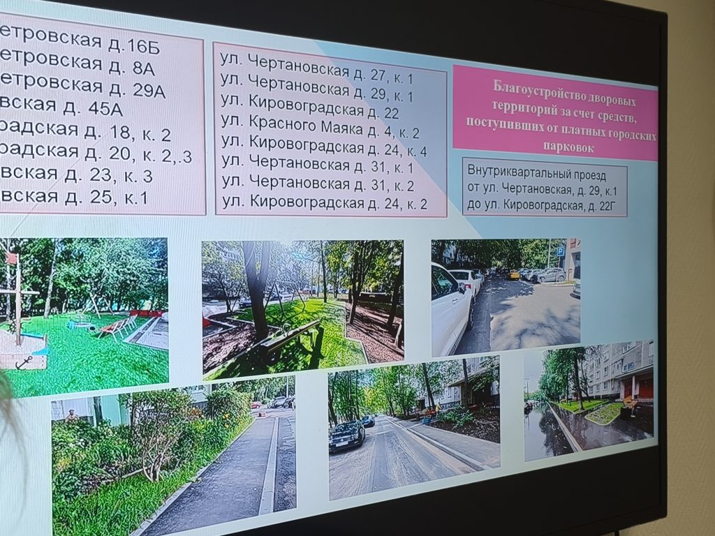 Галина Мокан рассказала о работах, которые провели в районе по благоустройству дворовых территорий. Прошедшим летом на средства, поступившие от платных парковок, были отремонтированы 16 дворовых территорий и один внутриквартальный проезд от дома №29, корпус 1 на улице Чертановской до дома №22Г на Кировоградской улице.